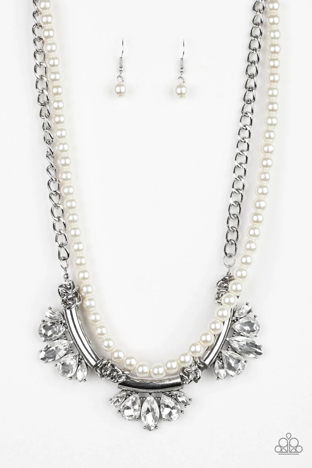 Bow Before The Queen White Pearl & Rhinestone Silver Layered Necklace Paparazzi N1905