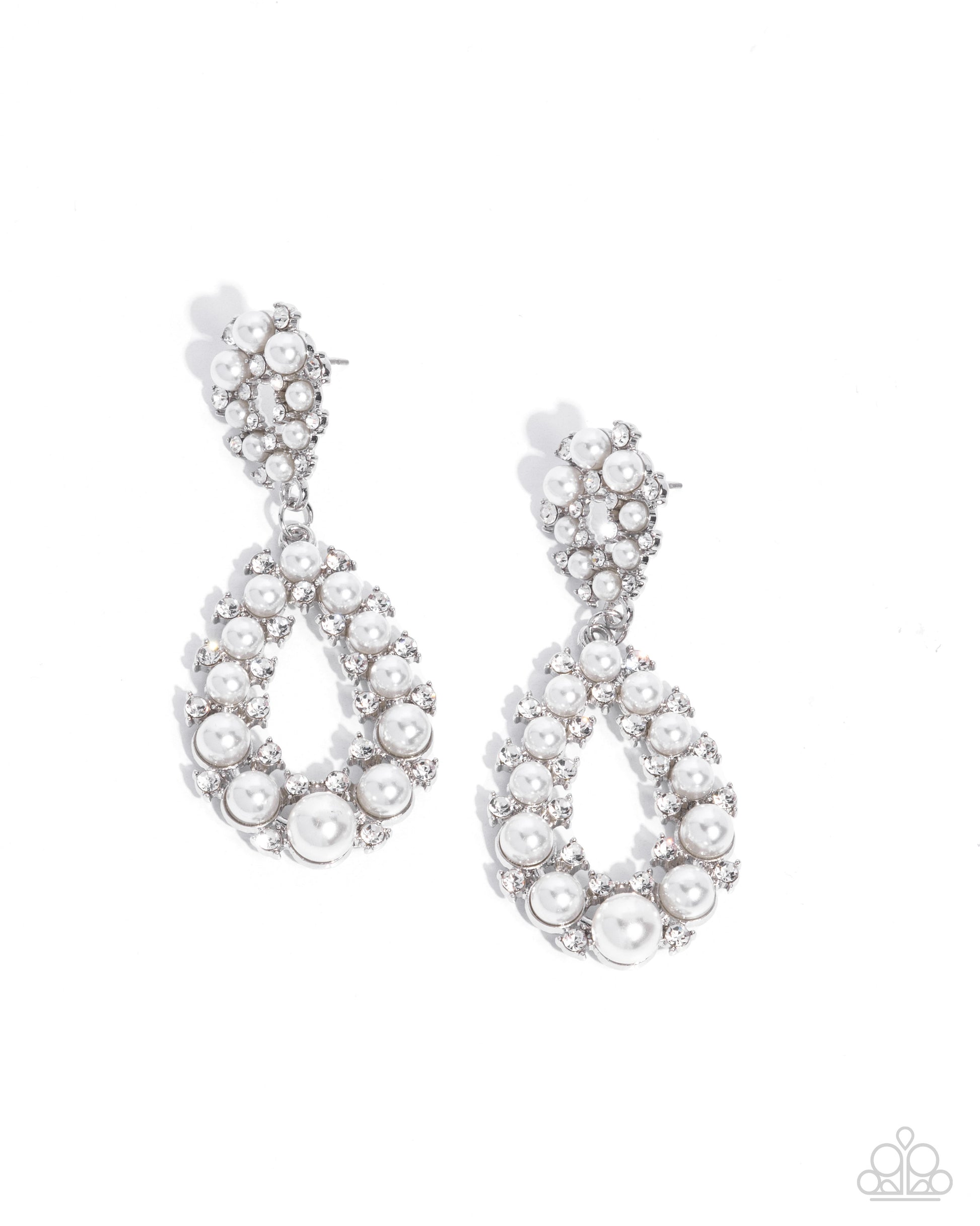 Dapper Debut - White Rhinestone & Pearl Silver Teardrop Earring Paparazzi