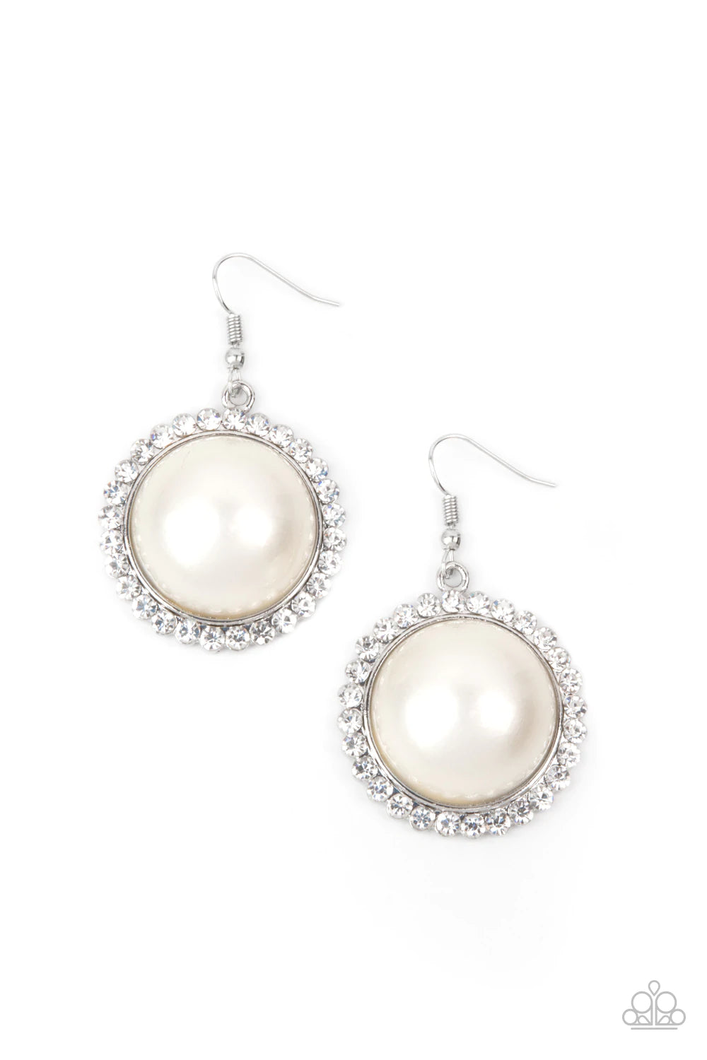 A dramatically oversized pearl drop is pressed into the center of a round silver frame bordered in glassy white rhinestones, creating an elaborate centerpiece. Earring attaches to a standard fishhook fitting.
