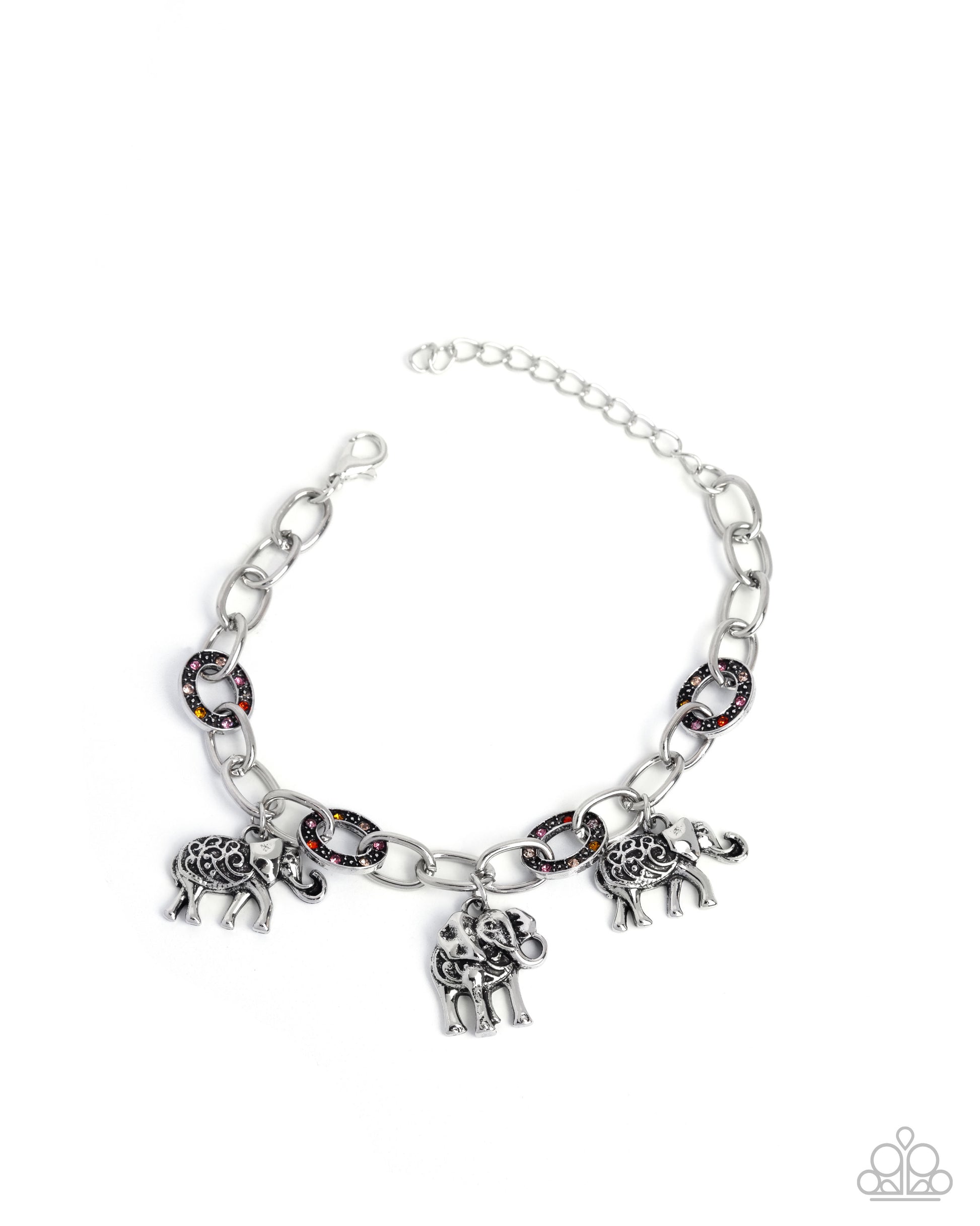 A chunky silver chain is adorned with ornately detailed elephant charms, each featuring embossed filigree motifs. Vibrant rhinestone-encrusted ovals link with the chain, adding a pop of color and sparkle to the design, enhancing its playful yet elegant aesthetic. Features an adjustable clasp closure.