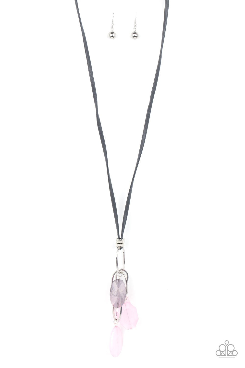 A lively mixture of oversized silver oval links and pink and grey acrylic beads swing from a lengthened gray leather cord. The transparent pink teardrop, cloudy pink octagon, and marbled oval shapes create a flirty statement. Features an adjustable clasp closure.