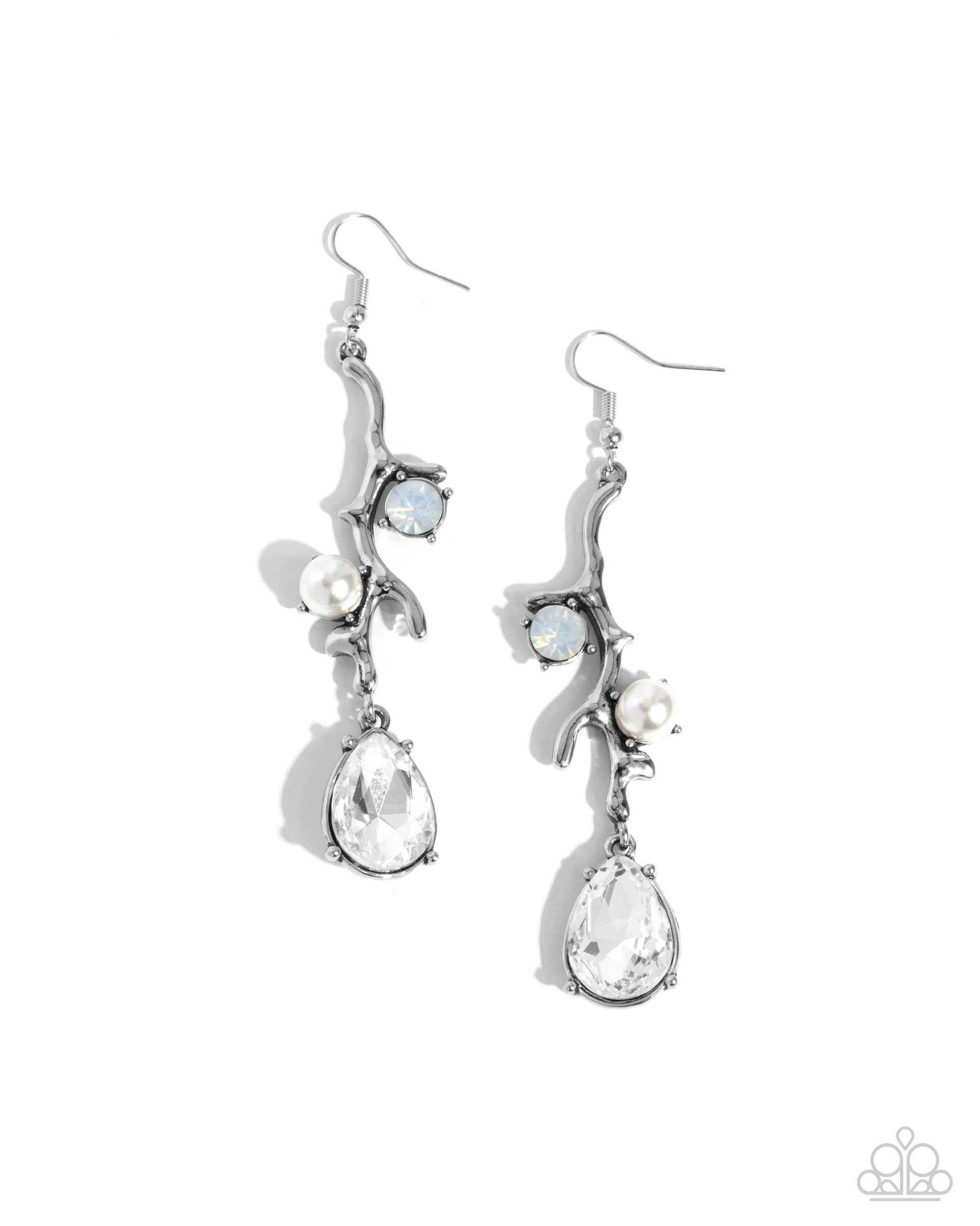 Delicate branches of silver lead to an elegant cascade of embellishments, including opalescent rhinestones, white pearls, and brilliant teardrop-shaped gems. The mix of textures and shapes creates a refined yet whimsical look. Earring attaches to a standard fishhook fitting.