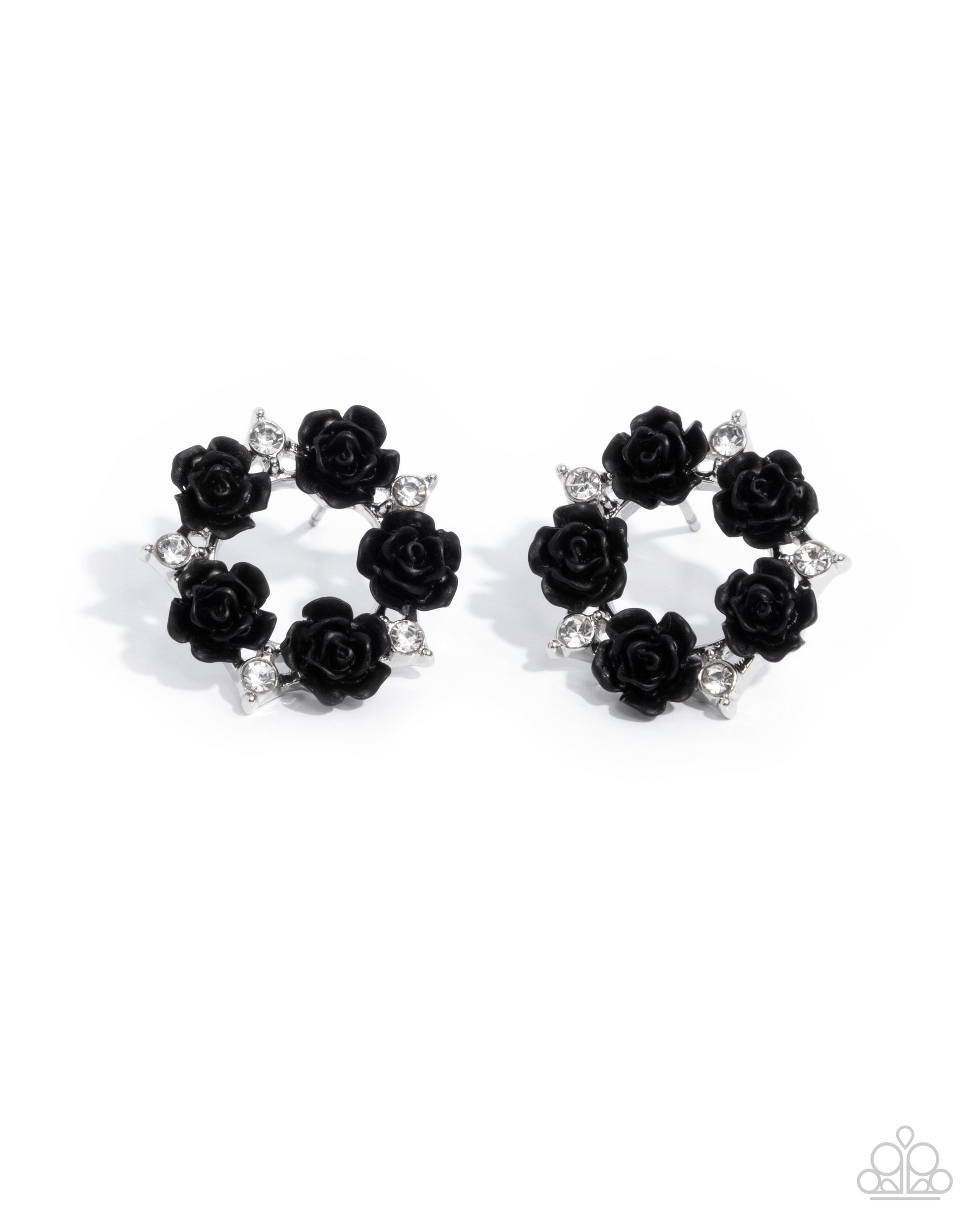 Grace Personified - Black Rosette & White Rhinestone Post Earring Paparazzi E2463