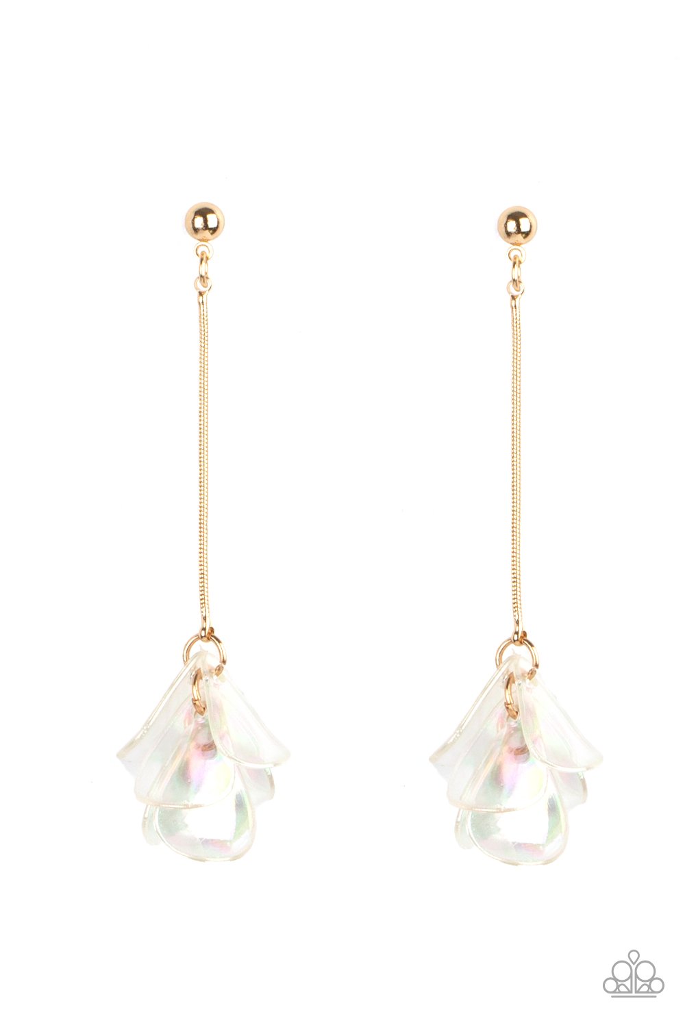 Iridescent acrylic petals delicately cluster at the bottom of a shiny gold chain, creating an ethereal tassel. Earring attaches to a standard post fitting.