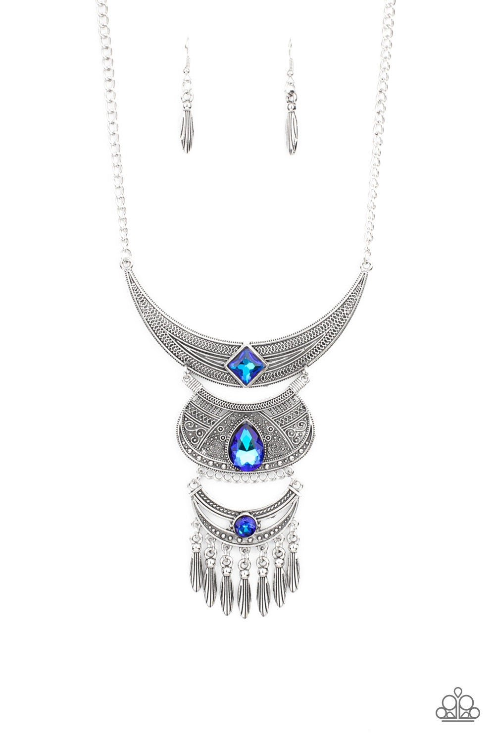 Lunar Enchantment - Blue UV Shimmer Rhinestone Silver Half Moon Plate Necklace Paparazzi N0314