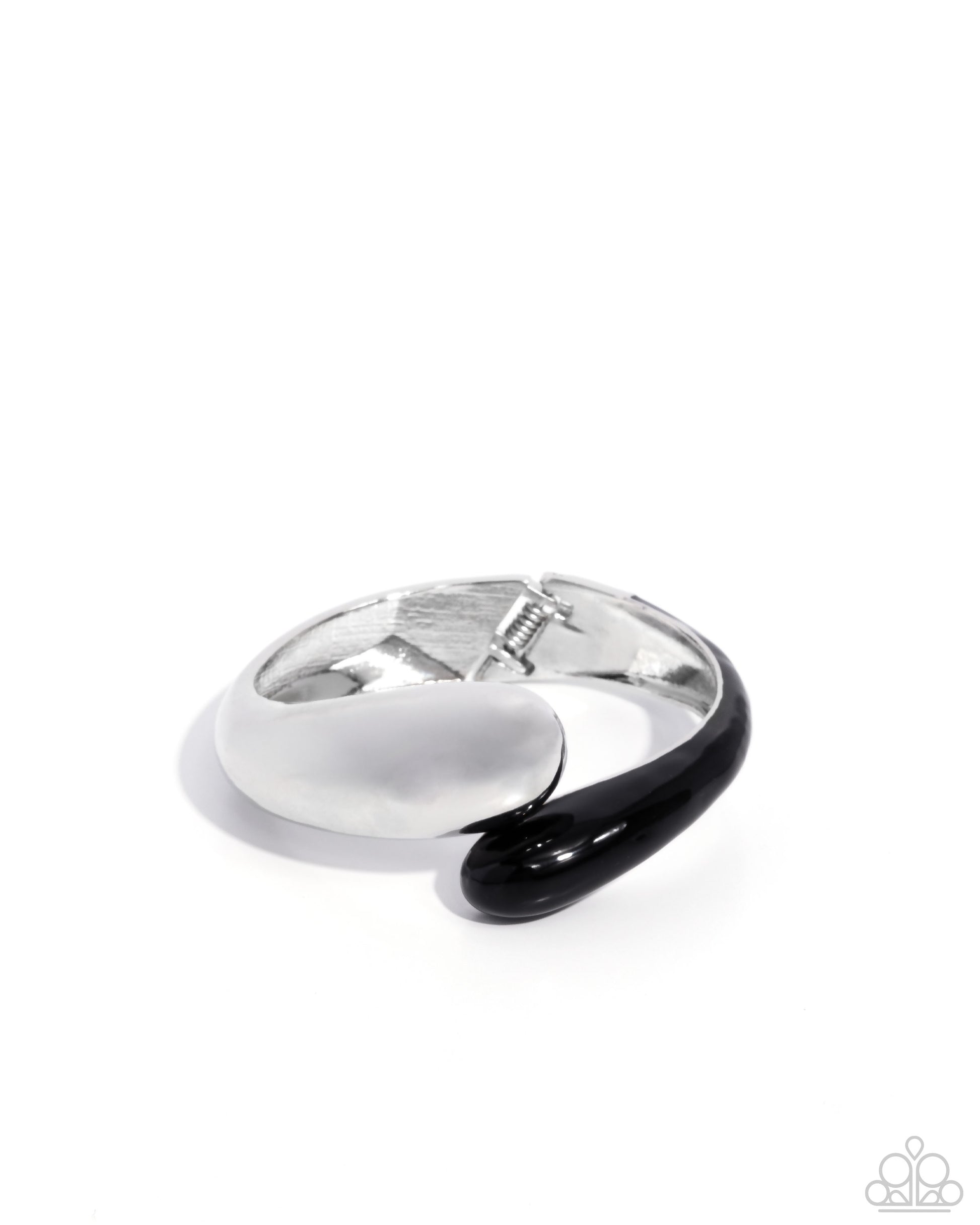 A sleek bangle-like design is accented with a smooth, black-painted finish on one side, while the other reflects light off a smooth silver finish. Features a hinge closure.