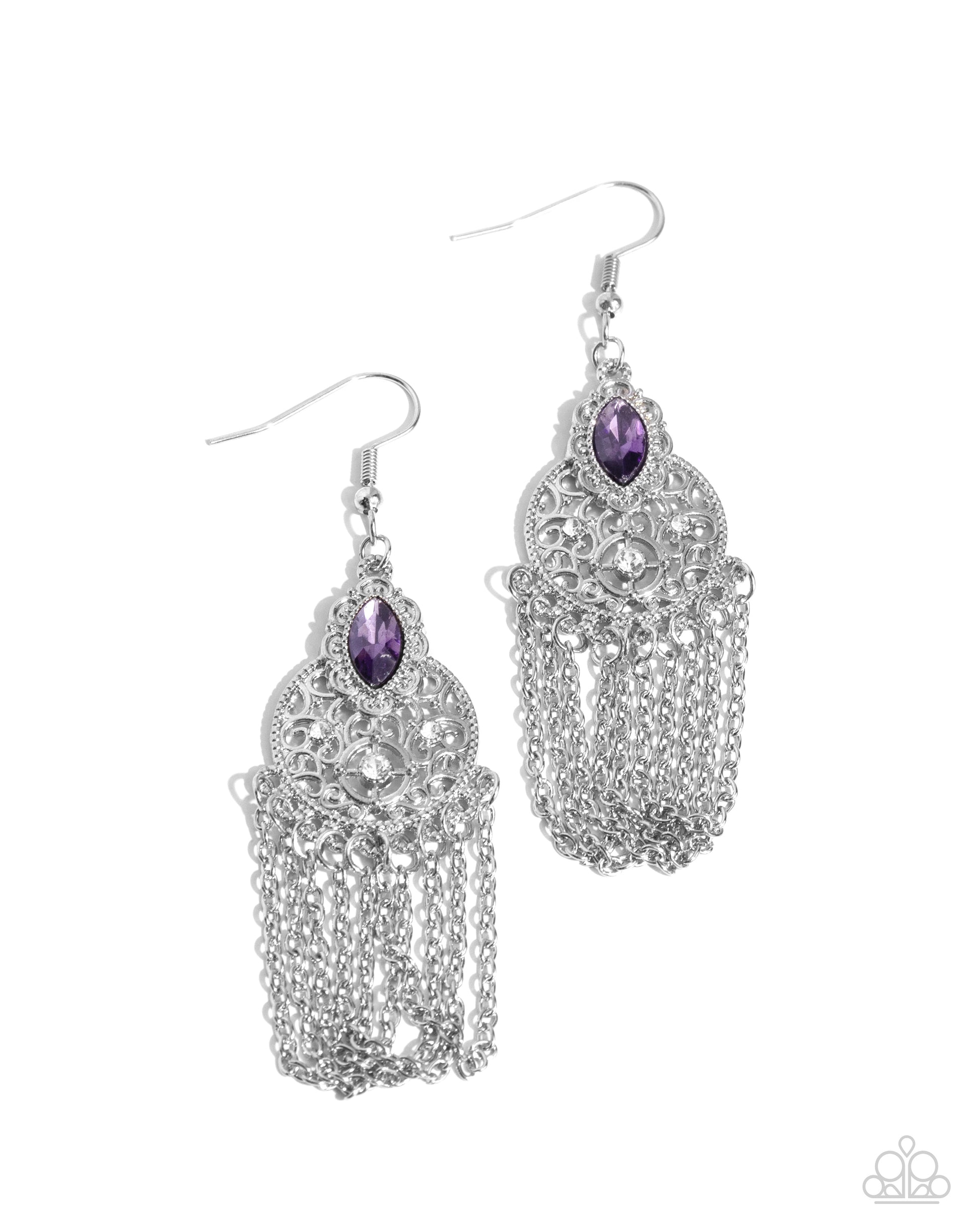 Pressed for CHIME - Purple Rhinestone Silver Filigree & Fringe Chain Earring Paparazzi E2963