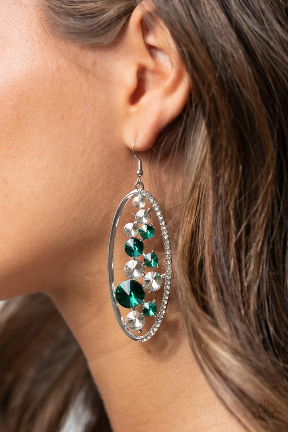 An oversized collection of glassy white and glittery green rhinestones sparkle inside a silver oval frame. One side of the frame is encrusted in dainty white rhinestones, adding a refined flair to the bubbly lure. Earring attaches to a standard fishhook fitting.