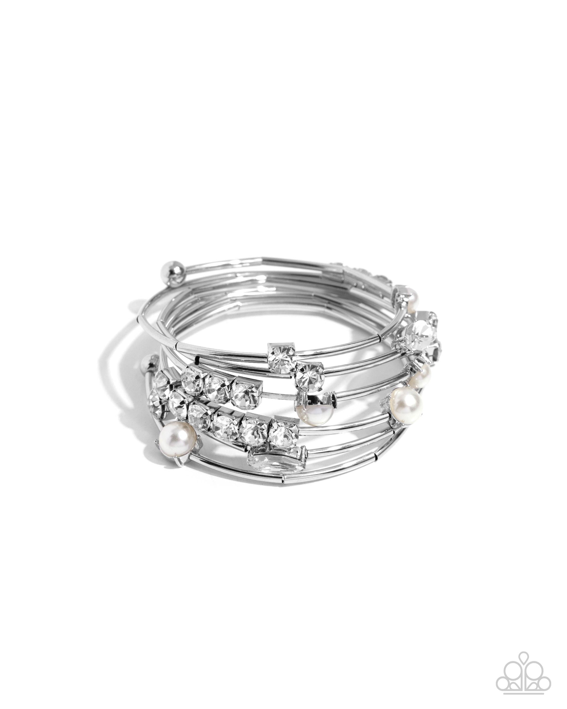 Showtime Sparkle - White Gem, Pearl, Silver Coil Bracelet Paparazzi B0562