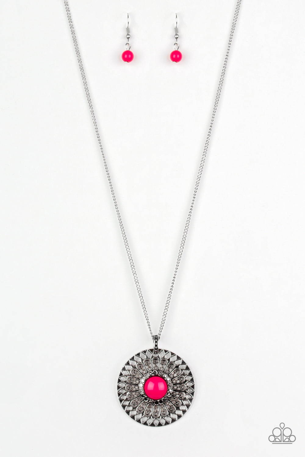A vivacious pink bead is pressed into the center of a silver medallion radiating with ornate sunburst textures for a whimsical look. Features an adjustable clasp closure.