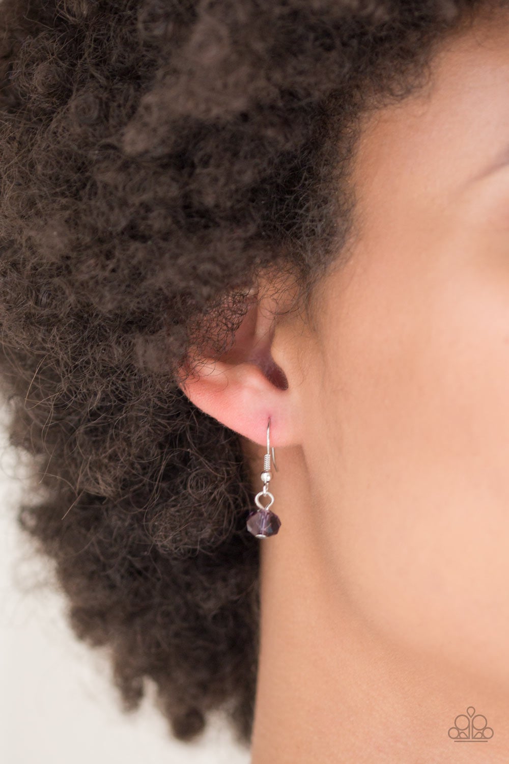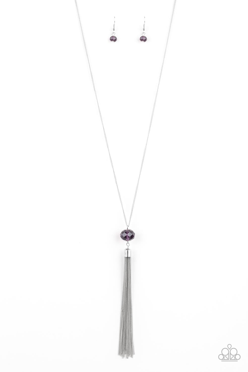 A glittery purple crystal-like bead swings from the bottom of a lengthened silver chain, giving way to a shimmering silver tassel for a glamorous finish. Features an adjustable clasp closure.