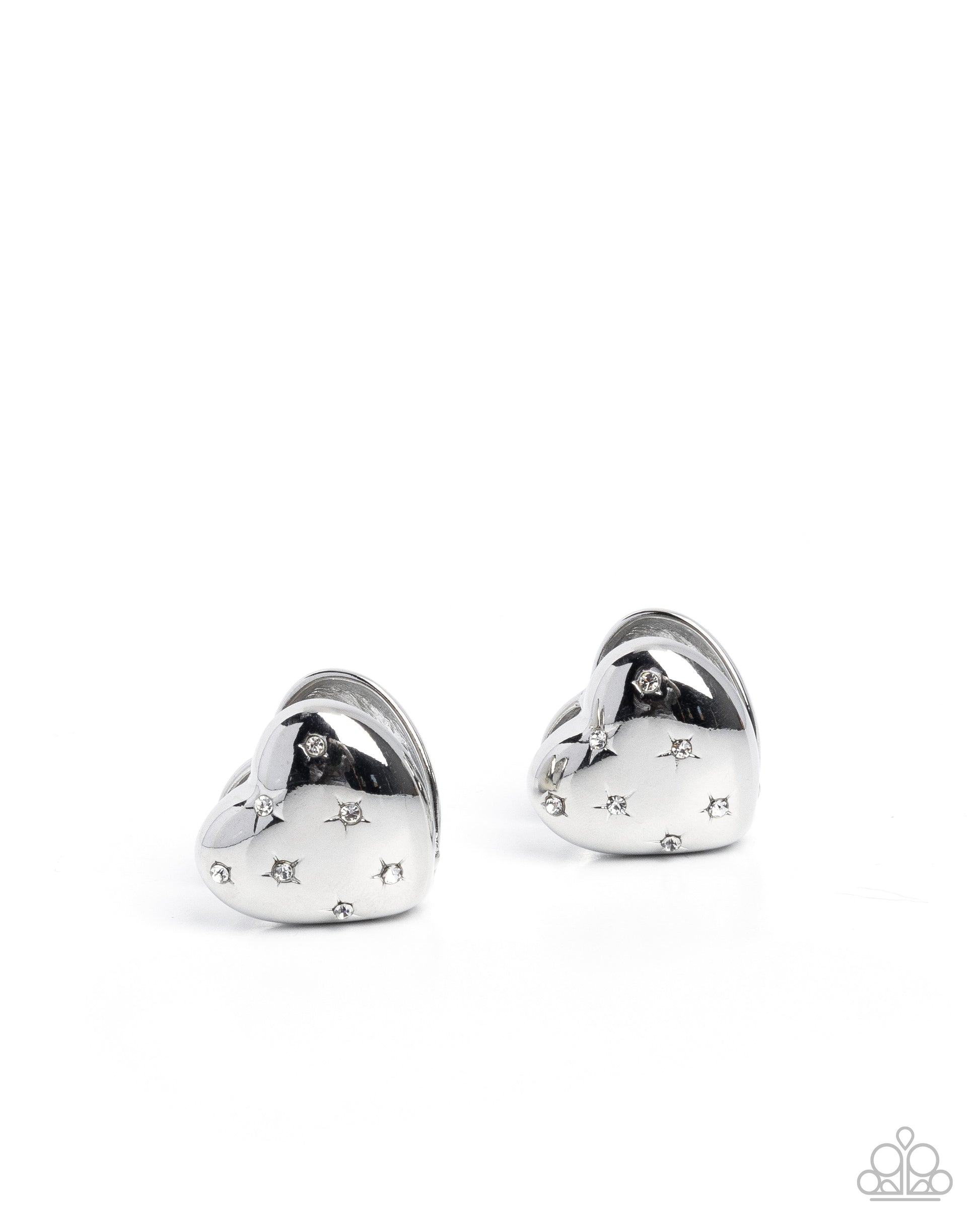 Sweetheart Stars - White Rhinestone Stars Silver Hinge 3/4 Inch Hoop Heart Earring Paparazzi