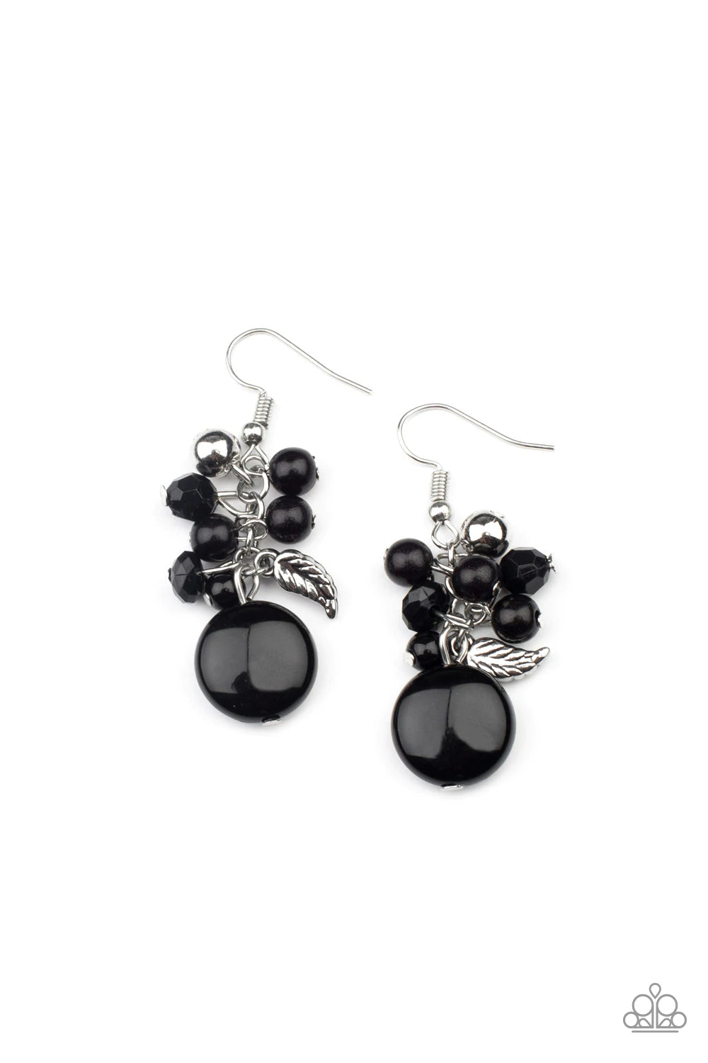 A cluster of black faceted beads, accented with a shiny silver bead and a delicate silver feather, tumble together atop a flattened black bead for a whimsical finish. Earring attaches to a standard fishhook fitting.
